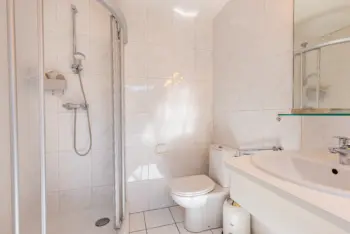 2e Badezimmer mit Dusche, Waschbecken und Toilette.