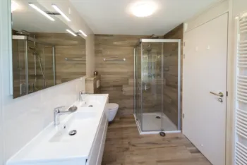 2 badkamers op de begane grond, waarvan 1 grenzend aan de ouderslaapkamer met ligbad, douche, dubbele wastafel en toilet. 2e badkamer met een douche, wastafel en toilet.